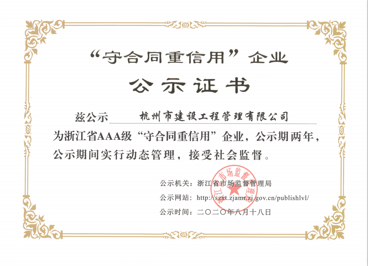 华体会(中国)建设工程管理有限公司荣获2020年浙江省AAA级“守合同重信用”公示证书,不仅证实了杭建“不信不立,不诚不行”一诺千金的企业行为,而且证明了杭建人在砥砺前行的道路上工作井然有序与有条不紊,我们将坚持以严谨的工作态度、实事求是、科学公正的立场,致力于招标代理和造价咨询事业。公司全体员工衷心感谢广大新老客户对公司发展的支持和帮助!